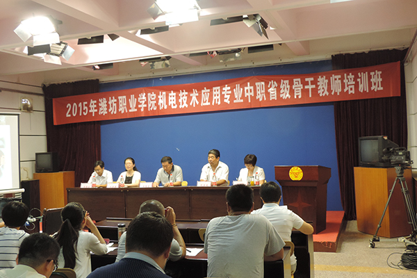 7月13日,由我院机电工程学院主办的2015年山东省中职机电技术应用专业骨干教师培训班在我院开班。学院党委副书记宋桂言、潍坊市职业教研室领导及学院教务处、机电工程学院负责同志出席开班仪式。全省36名机电技术应用专业骨干教师、辅导员以及本次培训上课教师等参加会议。